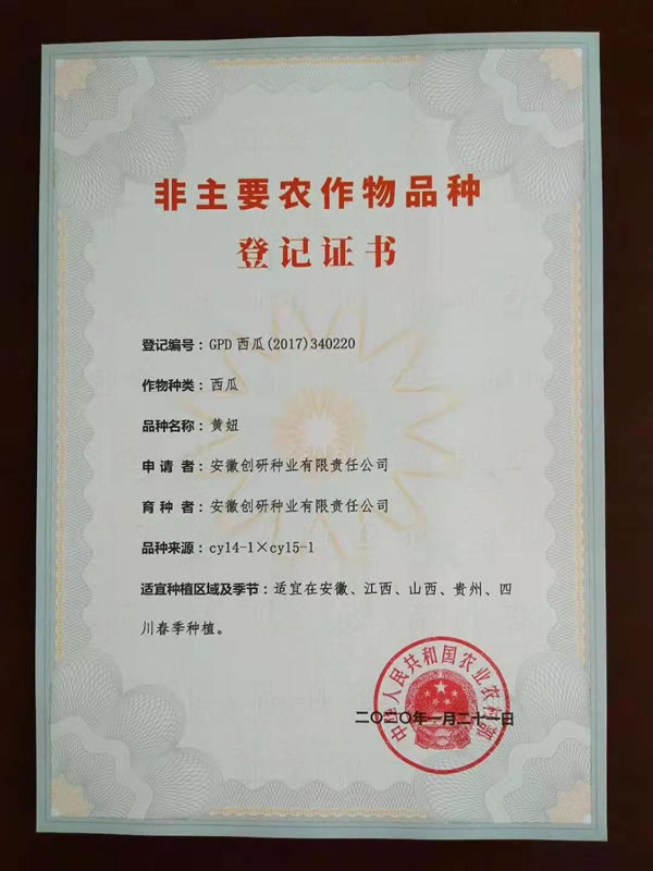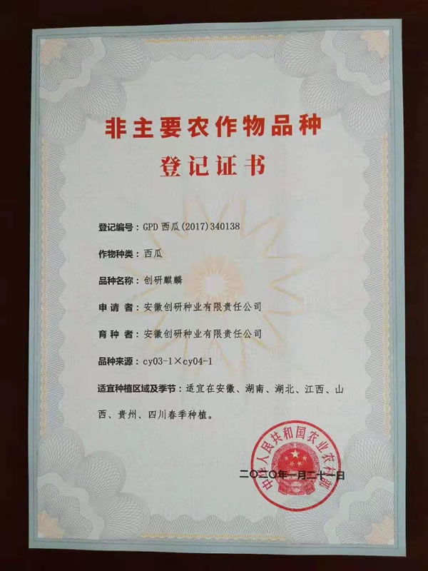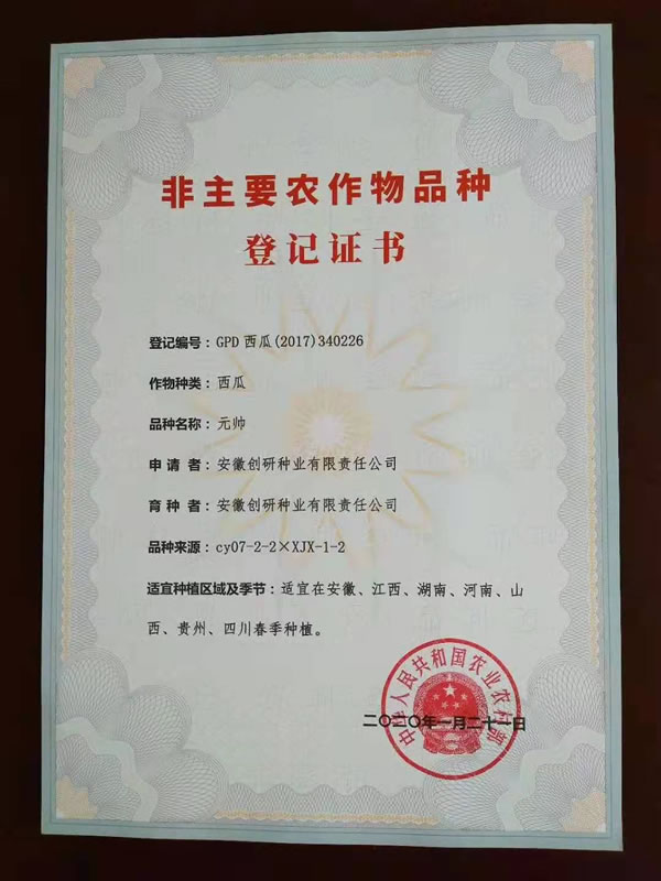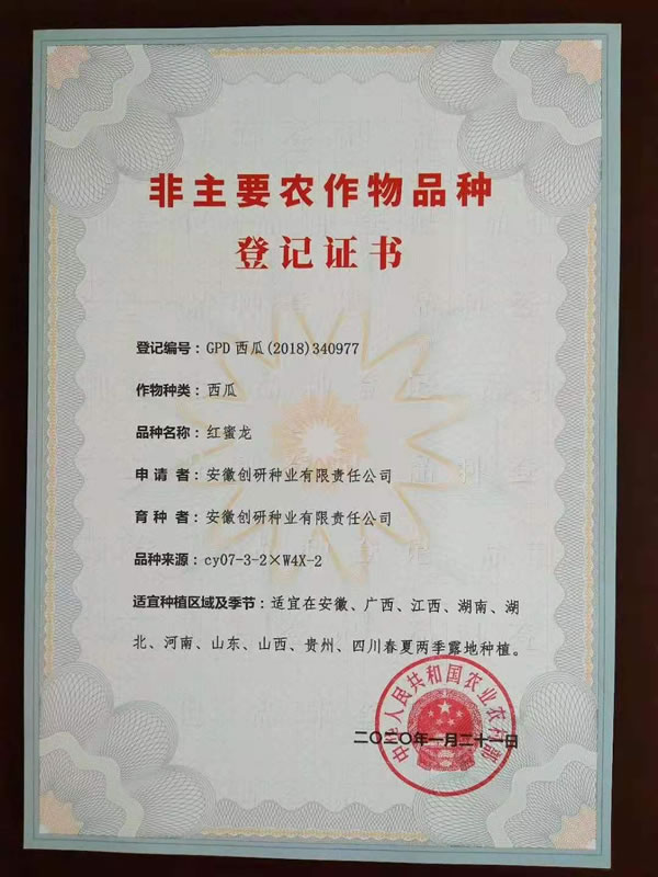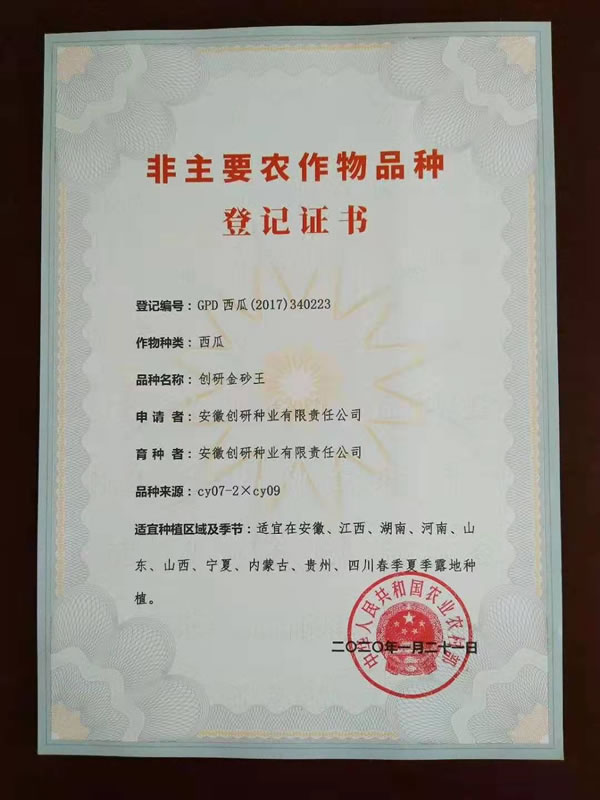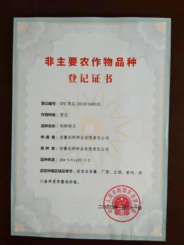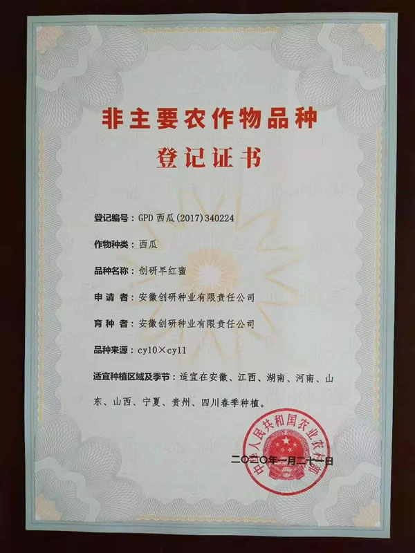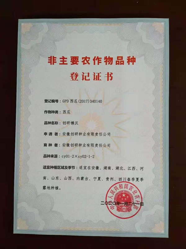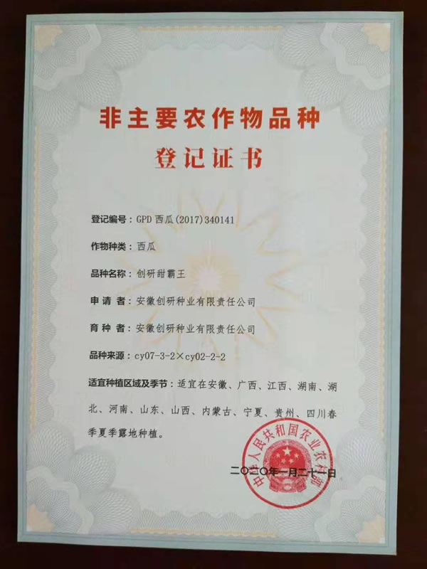新收到9份增加贵州、四川区域的国家品种登记证书。至此,创研种业自主选育并通过国家品种登记的西瓜品种18个,甜瓜品种4个。
