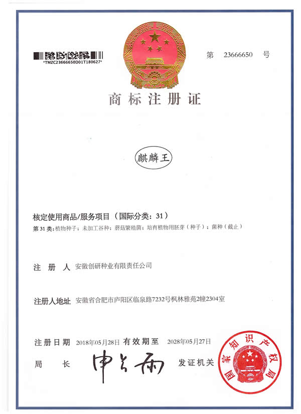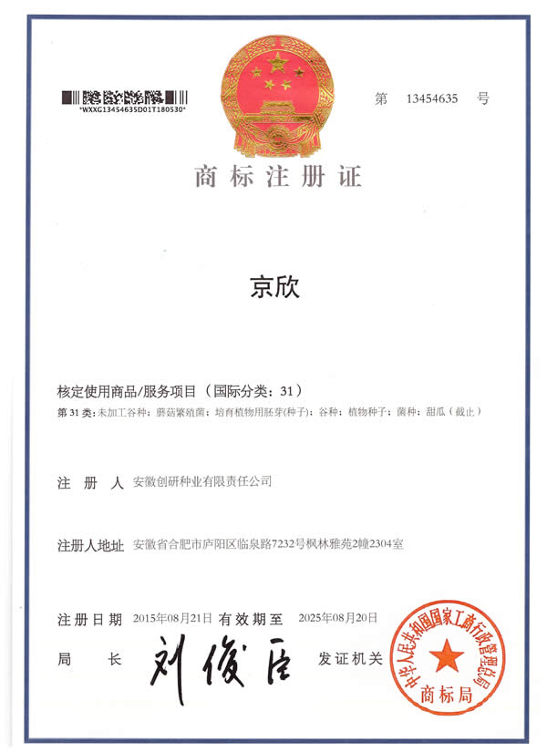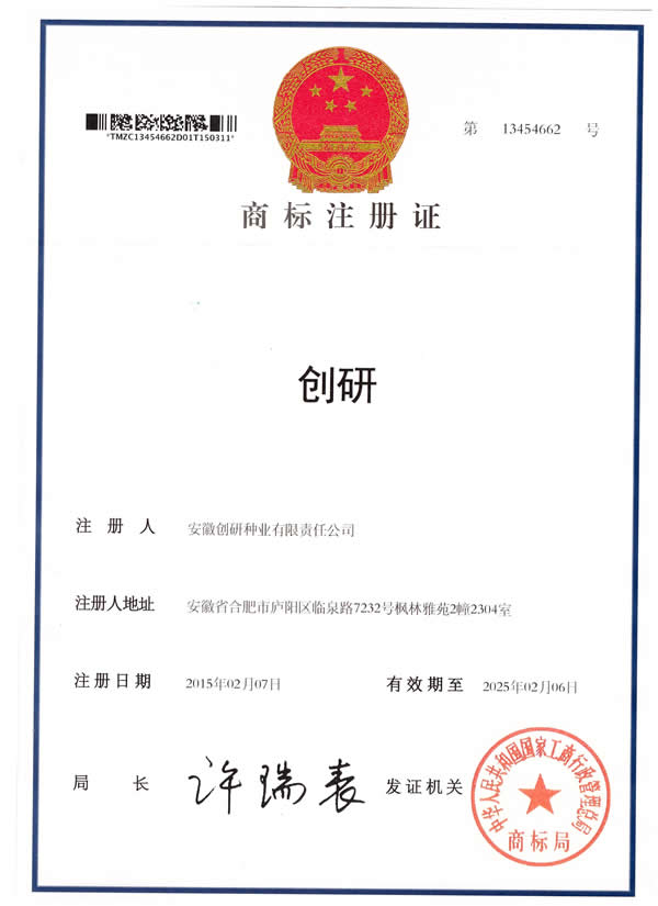 新收到“黄状元”商标注册证。随着产品畅销全国各地,我公司拥有的"创研”、"麒麟王”、“京欣”、“甜霸王”、“金砂五号”、“金砂王”、“红蜜龙”、“红天龙”等注册商标已成为行业内知名品牌。