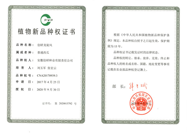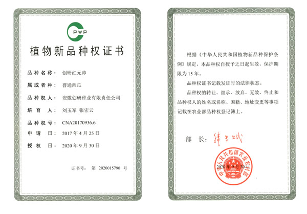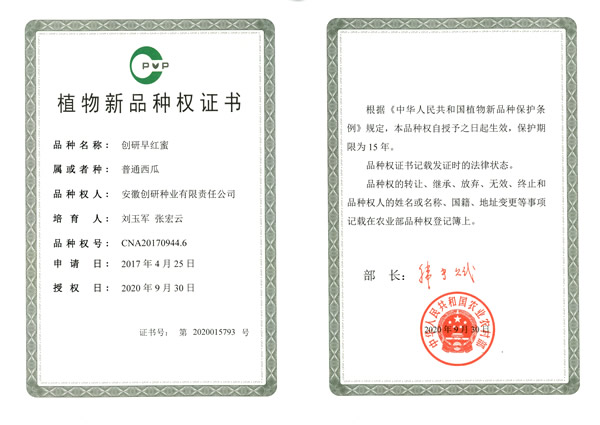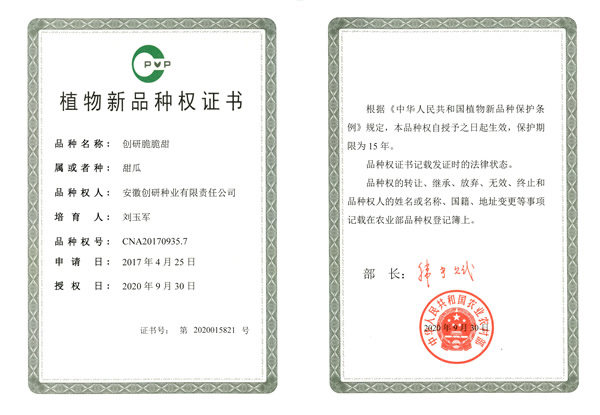 创研种业4个西瓜品种、1个甜瓜品种获得植物新品种权证书